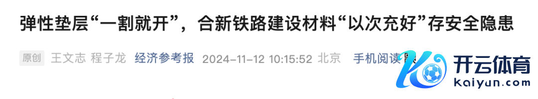 11月12日,新华社《经济参考报》刊发走访报谈《弹性垫层“一割就开”,合新铁路成立材料“以次充好”存安全隐患》一文,揭露了合新铁路(合肥至新沂)多家施工单元为节俭老本,以次充好,违纪将“三元乙丙橡胶弹性垫层”掉包为不稳当铁路行业圭臬的“再生胶仿成品”,这些仿冒品质能远低于蓄意条目,存在安全隐患。