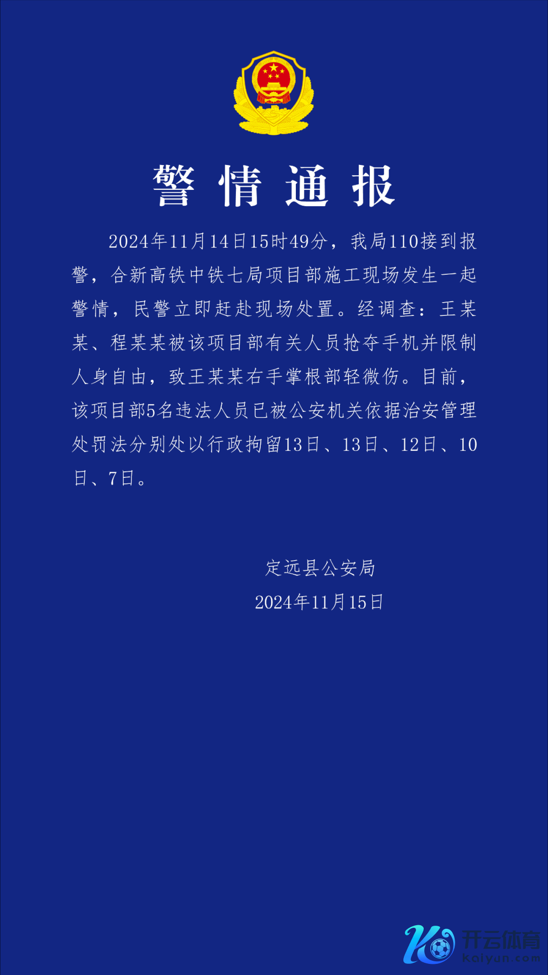 11月15昼夜深,安徽定远县公安局发布警情通报,通报表现,11月14日在合新高铁中铁七局形态部施工现场,王某某、程某某被该形态部关联东谈主员剥夺手机并终了东谈主身解放,致王某某右手掌根部细小伤。现在,该形态部5名监犯东谈主员已被行政拘留。
