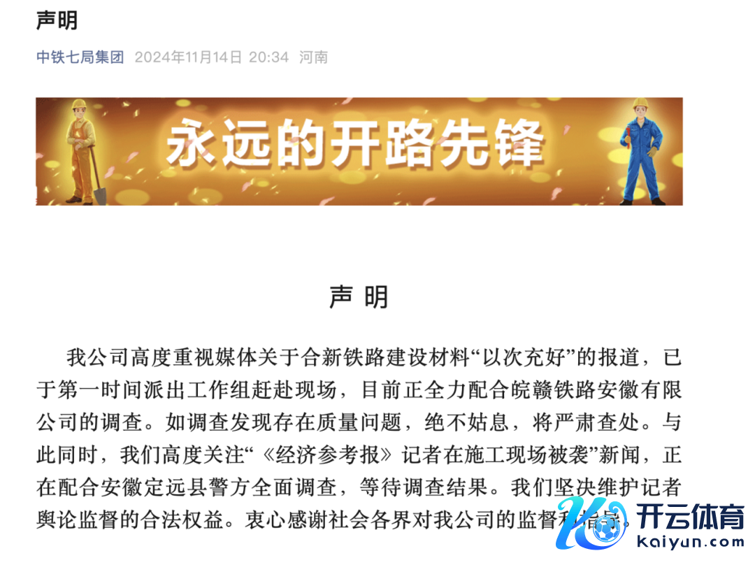 11月14日晚,中铁七局集团发布声明,公司高度爱好媒体对于合新铁路成立材料“以次充好”的报谈,已于第一期间派出使命组前去现场,现在正全力合作皖赣铁路安徽有限公司的走访。如走访发现有在质料问题,毫不姑息,将严肃查处。与此同期,公司高度心计“《经济参考报》记者在施工现场被袭”新闻,正在合作安徽定远县警方全面走访,恭候走访遵守。公司矍铄爱戴记者公论监督的正当权柄。