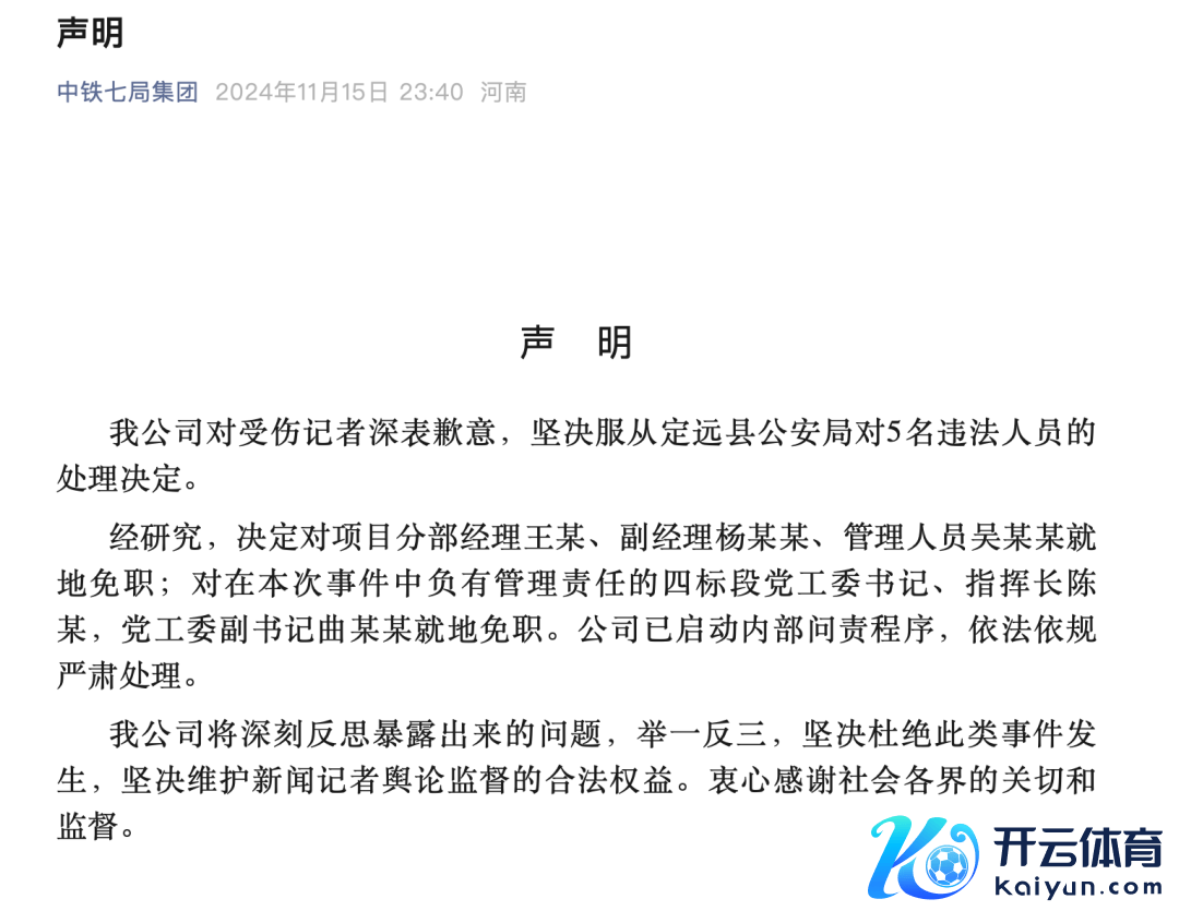 同期,声明称,决定对形态分部司理王某、副司理杨某某、管束东谈主员吴某某飞速免职;对在本次事件中负有管束包袱的四标段党工委通知、素质长陈某,党工委副通知曲某某飞速免职。