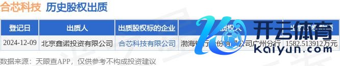 证券之星音信,笔据天眼查APP清醒,在12月9日登记的一则股权出质信息(登记编号:1220241210050901)中,北京鑫诺投资有限公司出质其所握有的合芯科技有限公司股权,出质股权数额为1582.513912万元,质权东说念主为渤海银行股份有限公司广州分行。