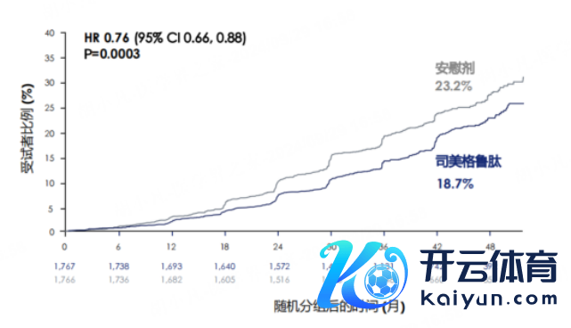究诘戒指涌现,中位随访3.4年,与安危剂比拟,司好意思格鲁肽显耀镌汰主要肾脏事件风险达24%(HR 0.76,95%CI:0.66~0.88,P=0.0003)(图4)。在确证性次要至极中,司好意思格鲁肽1.0mg组eGFR斜率显耀更小,与安危剂的年变化率组间各别为1.16ml/min/1.73m2(95% CI:0.86~1.47;P<0.001);MACE风险显耀镌汰18%(HR:0.82;95% CI:0.68~0.98;P=0.029);全因死亡风险镌汰20%(HR:0.80;95% CI:0.67~0.95;P=0.01)[10]。