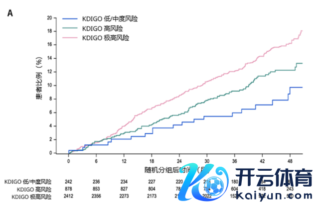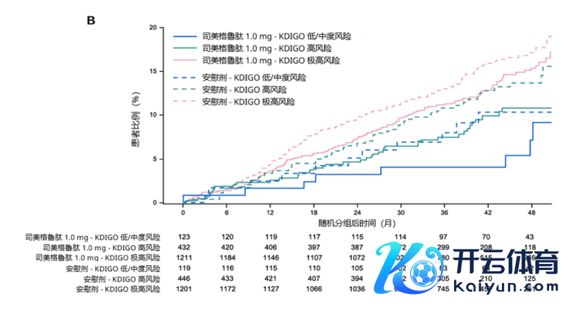 在这项二次分析中,究诘者根据改善群众肾脏病预后组织(KDIGO)指南对FLOW受试者的肾脏功能进行肾病推崇危机分层,其中2412例(68.3%)患者为极高风险,878例(24.9%)为高风险,242例(6.8%)为低/中风险。图7展示了不同肾病推崇风险级别受试者至初次MACE发生的时刻,总体而言,具有较高的KDIGO风险级别的患者MACE风险也有更高的趋势[13]。