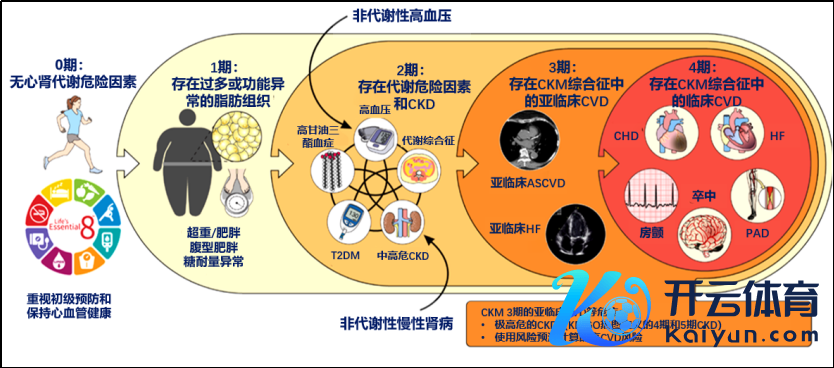 一年前AHA对心血管-肾脏-代谢空洞征(CKM)观念的提议恰是标识了心内科医师这一不雅念的篡改[8]。CKM界说为一种由痴肥、糖尿病、慢性肾脏疾病和心血管疾病[包括心力枯竭(HF)、心房轰动(AF)、冠心病(CHD)、脑卒中庸外周动脉疾病(PAD)]之间病理生理彼此作用导致的全身性疾病[8]。由于疾病的复杂及全体性,CKM高风险东说念主群的全程诊疗旅途中,均应进行空洞的筛查及全面的评估。