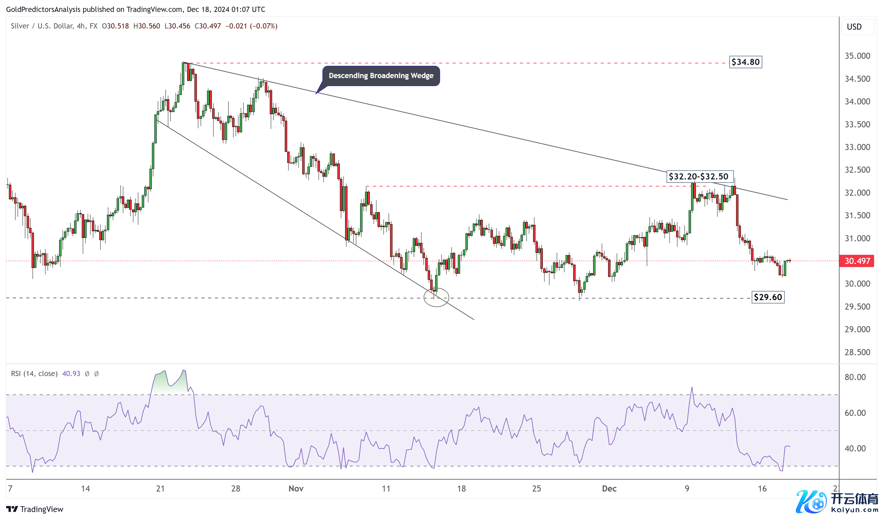 白银4小时图显现,价钱未能冲突32.50好意思元的阻力位,并下落。价钱走势标明,在29.60好意思元至32.50好意思元区域内,价钱呈中性走势。RSI在较低水平的反弹标明,白银可能在29.60好意思元区域隔壁找到因循。由于流动性较弱,价钱在12月可能保执中性。好意思联储的决定可能会激发一些白银波动,但需要冲突32.50好意思元智力进一步高潮。