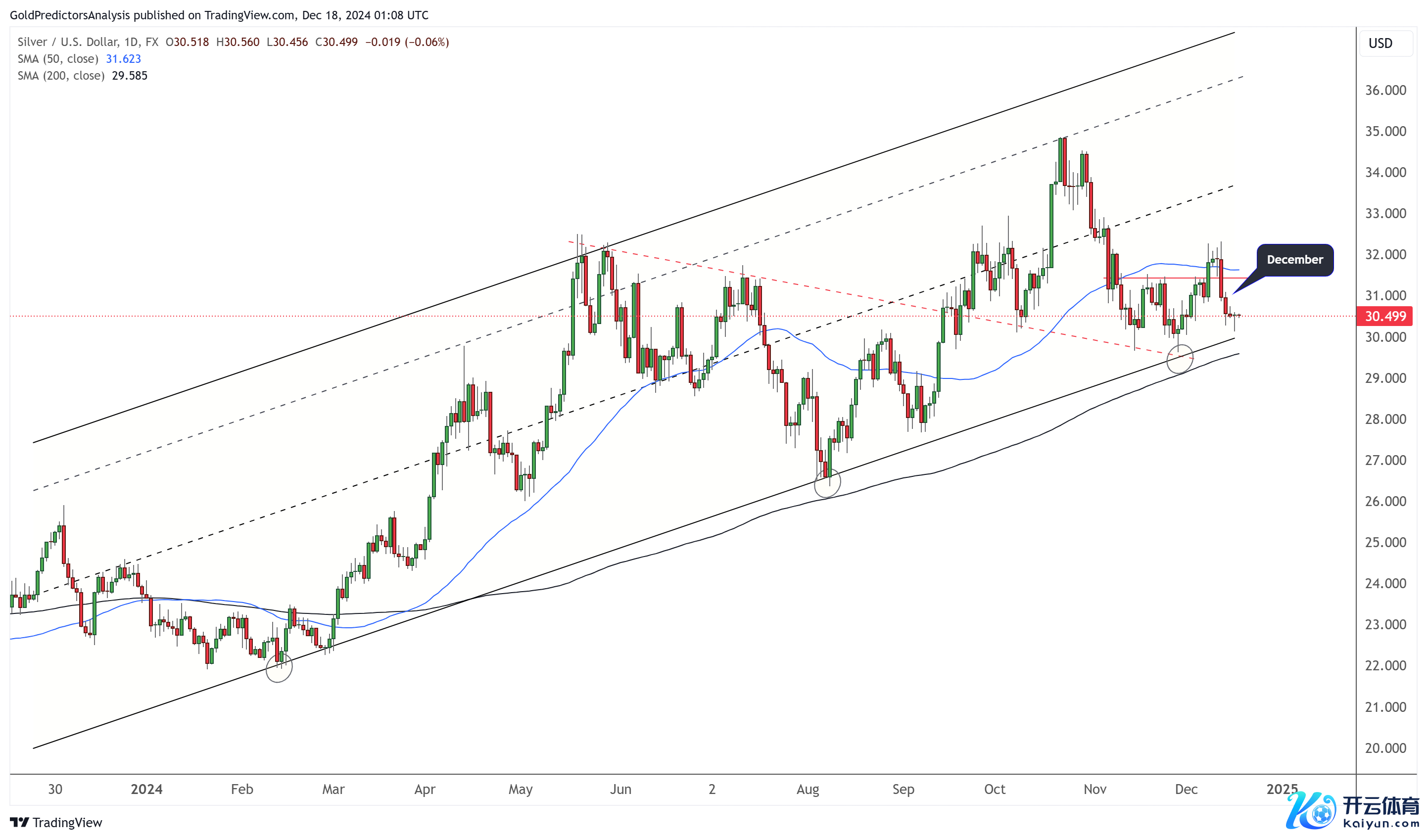 白银日线图显现,价钱在上升通说念内往复。价钱正在接近该通说念内的因循区域,约为29好意思元,跌破该水平可能激发苍劲下落。周二的日线图出现回转,但日线收盘价仍低于30.70好意思元,短期趋势保执中性。价钱咫尺在50日和200日SMA之间往复,标明缺少明确的地点。