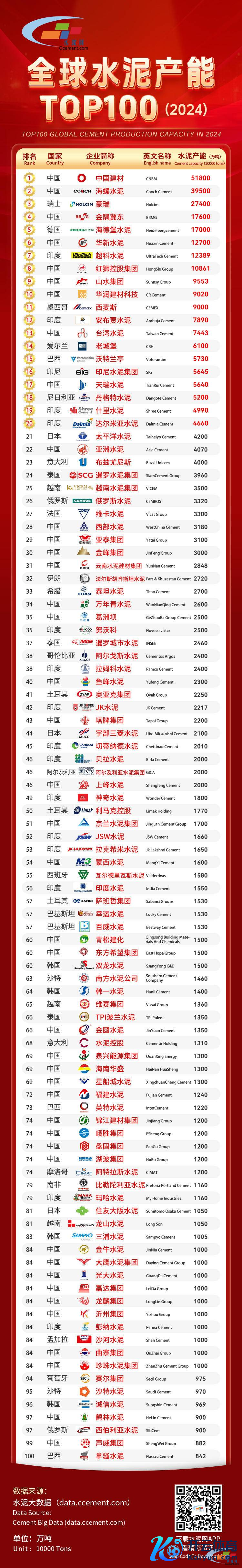 中国建材以51800万吨水泥产能位居专家水泥产能TOP100榜首,来自巴西的拿骚水泥以842万吨水泥产能成为专家水泥TOP100的守门员。